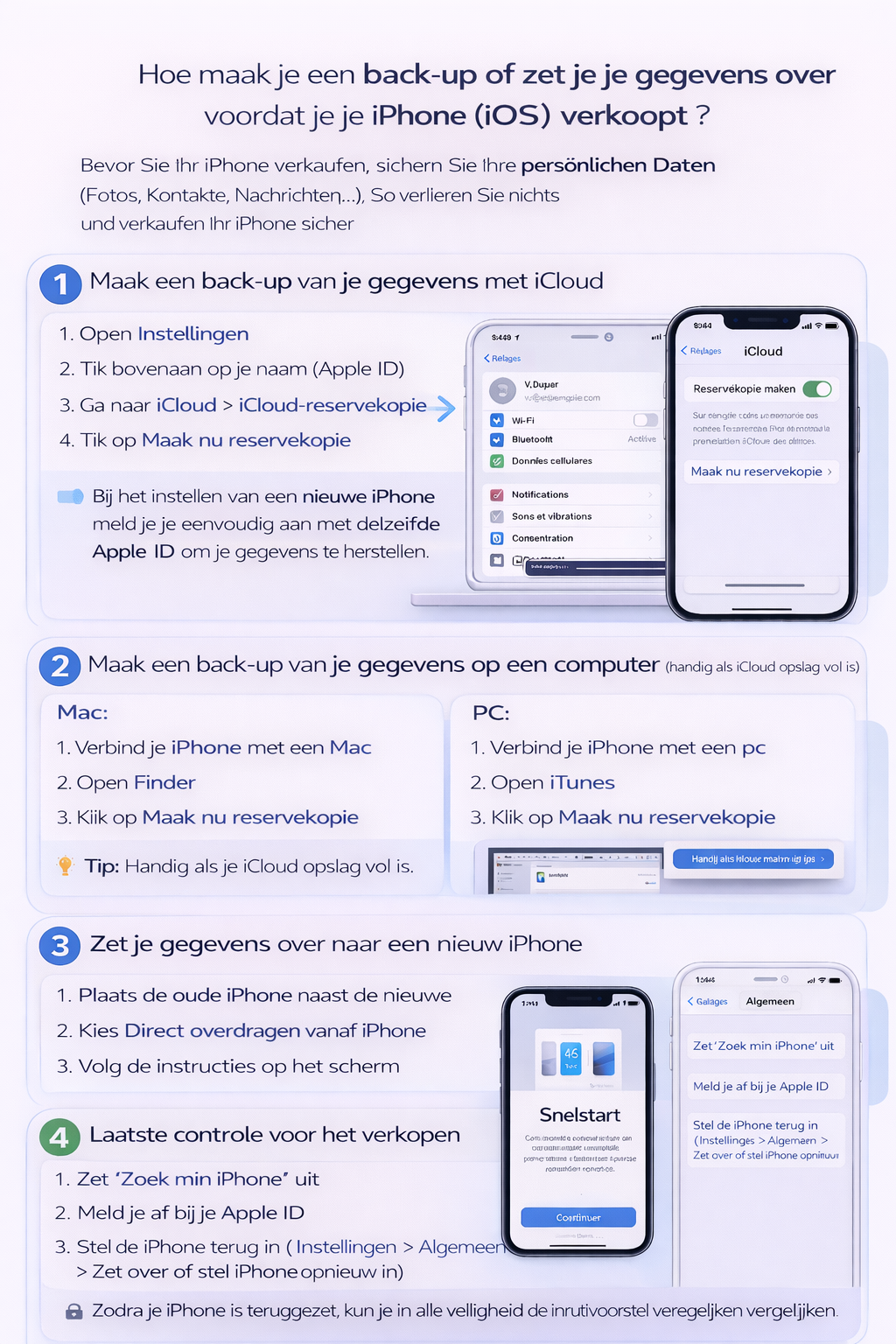Voordat je je iPhone verkoopt, is het belangrijk om een back-up van je persoonlijke gegevens te maken (foto’s, contacten, berichten, apps). Zo raak je niets kwijt en kun je je iPhone veilig verkopen.