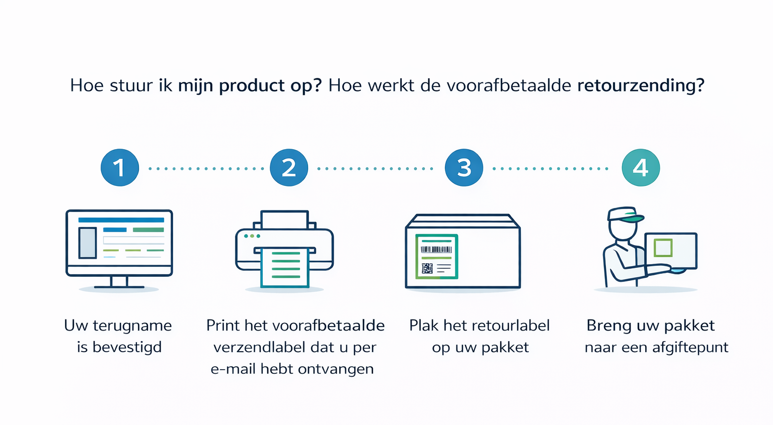 Zodra je aanvraag is gevalideerd, kun je je product gratis retourneren. We stellen binnen 3 werkdagen na ontvangst een diagnose van je product.